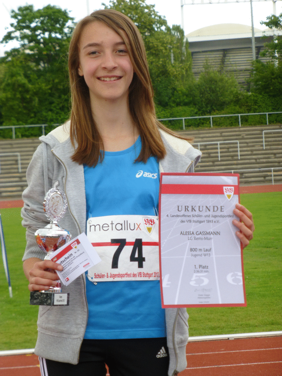 Alessa Gassmann W13 wird Leutenbachs neue Mittelstreckenläuferin. Alessa verbesserte ihre 800 m Bestzeit von 2011 um 14 sec. auf 2.41.44 min.
